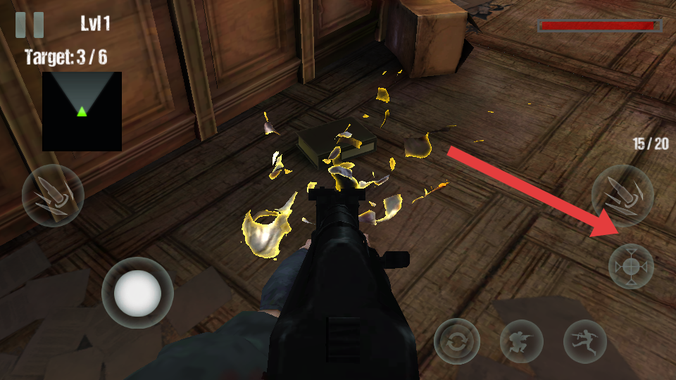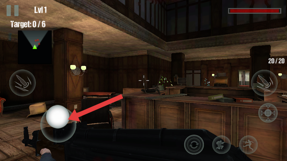 2、基本玩法,以第一人稱視角在復(fù)古木質(zhì)大廳中操控槍械,攻擊帶有綠色熒光的僵尸;屏幕的左上角顯示任務(wù)的進(jìn)度。