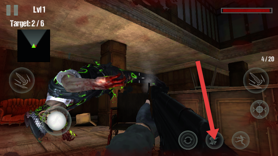 3、場景為復(fù)古木質(zhì)大廳,內(nèi)有桌椅、沙發(fā)、書架等家具陳設(shè);敵人為帶有綠色熒光標(biāo)識的僵尸,戰(zhàn)斗過程中特效明顯。