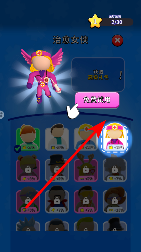 3、隨著治療病人數(shù)量的增加,會(huì)獲取一定資源,這時(shí)查看可解鎖的角色,像治愈女俠,點(diǎn)擊試用來(lái)解鎖,借助新角色的能力提升醫(yī)院的治療效率和收益。
