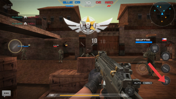 3、場(chǎng)景與元素,場(chǎng)景為沙漠風(fēng)格巷戰(zhàn)地圖,包含磚石建筑、木箱等掩體;界面會(huì)顯示隊(duì)友名稱如GEOFFRE及陣營(yíng)標(biāo)識(shí)。