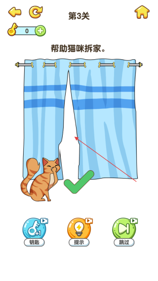 2、觀察場景,點擊屏幕中的窗簾,幫助貓咪把窗簾弄破,完成拆家任務(wù)。