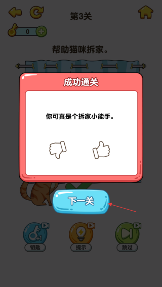 3、當(dāng)貓咪成功拆家,出現(xiàn)綠色對勾標(biāo)志后,點擊彈出的下一關(guān)按鈕,進(jìn)入下一個關(guān)卡挑戰(zhàn)。