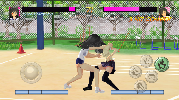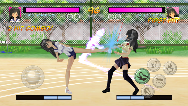 1、格斗對戰(zhàn)操作:玩家通過按鍵控制高中女生角色,利用基礎(chǔ)攻擊鍵發(fā)起連續(xù)打擊,當(dāng)能量積累夠時,按下技能鍵釋放專屬技能,在規(guī)定時間內(nèi)將對手血量降至零即可獲勝。