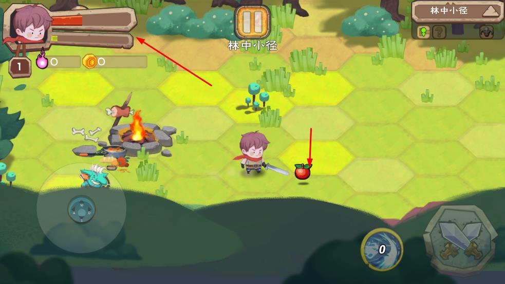 1、在林中小徑等場景探索,靠近蘋果等道具可收集,同時留意生命值,借助篝火等場景元素,為冒險提供助力。