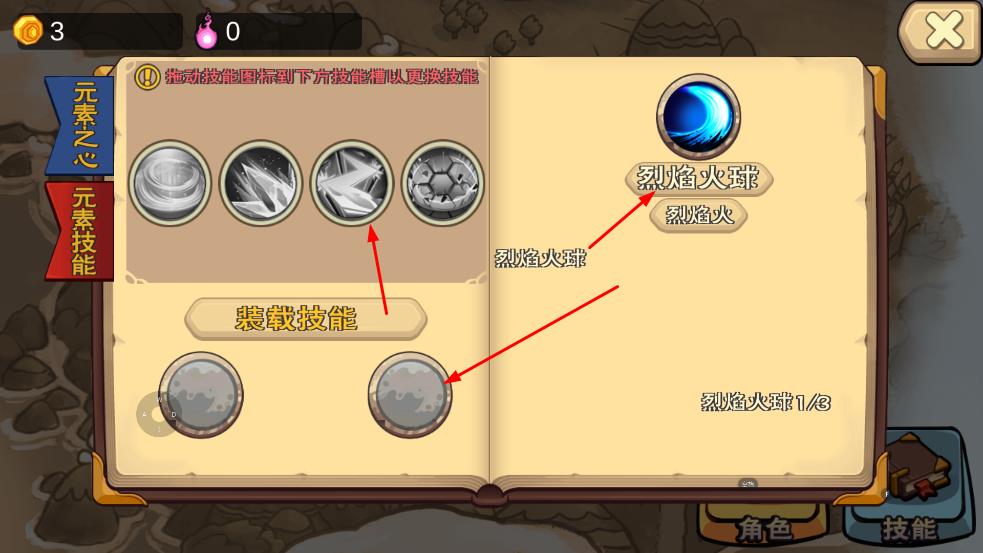 3、進入元素技能界面,拖動烈焰火球等技能圖標(biāo)到下方技能槽更換技能,在地圖上選擇解鎖的區(qū)域推進,開啟更多冒險內(nèi)容。