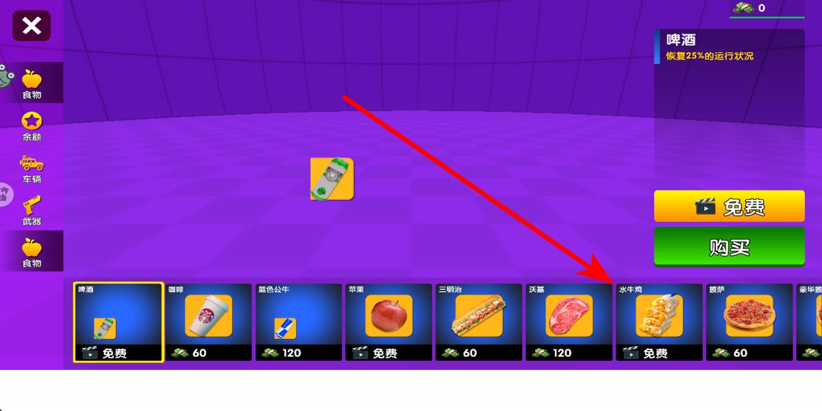 3、完成任務(wù)可前往商店,在商店里有啤酒咖啡蘋果等各類物品,根據(jù)需求點(diǎn)擊購(gòu)買或通過(guò)免費(fèi)途徑獲取心儀物品,豐富自己的物品儲(chǔ)備。