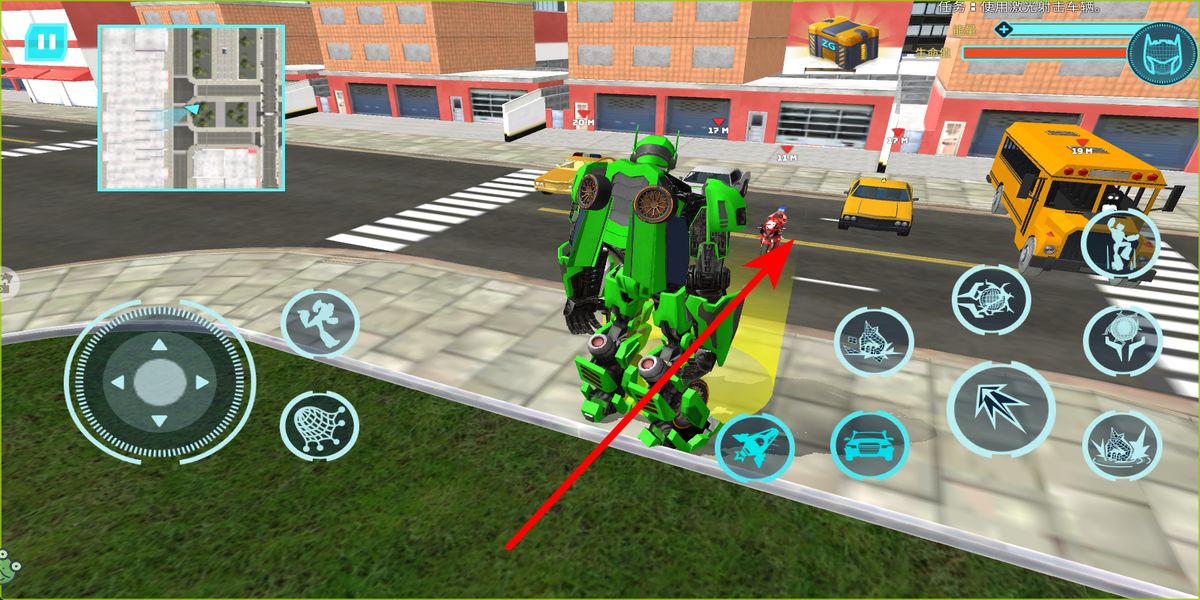 3、利用屏幕上的方向控制按鍵,操控機(jī)甲在城市道路等區(qū)域移動(dòng),根據(jù)任務(wù)提示,向目標(biāo)方向前進(jìn),完成諸如攻擊車輛等任務(wù)操作。