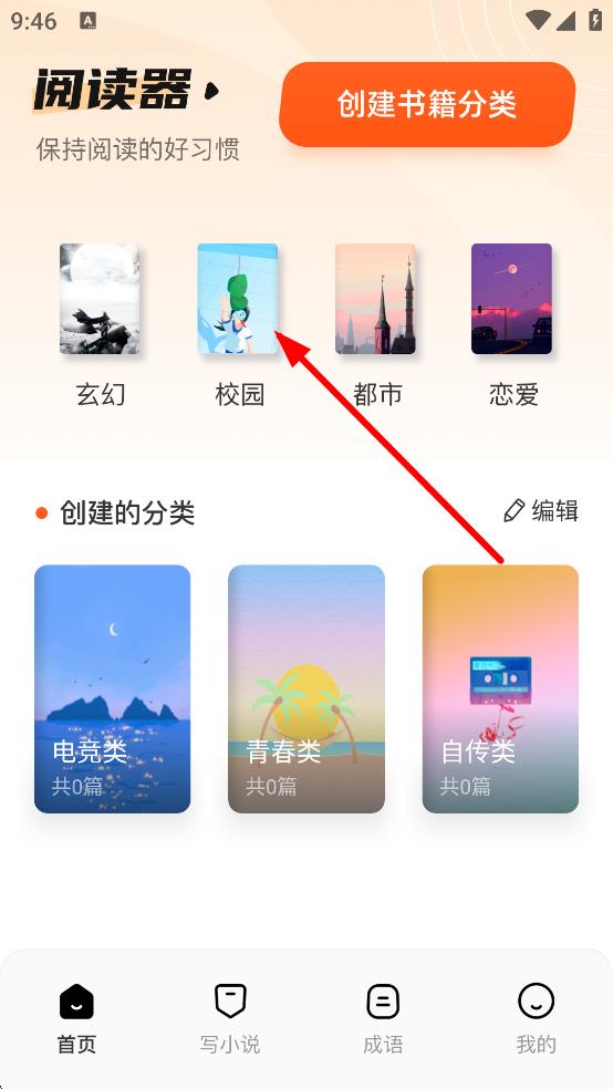 1、在閱讀器頁面,點擊校園的分類,進(jìn)入校園分類頁面。