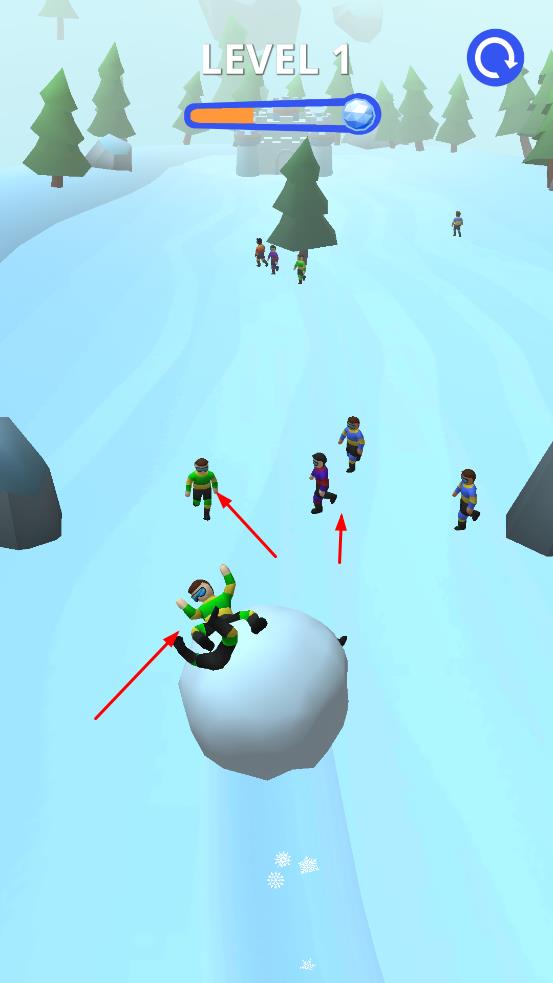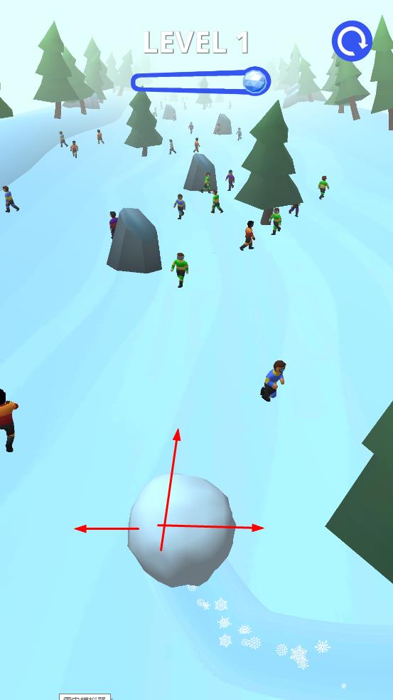 1、進(jìn)入LEVEL 1的雪地場(chǎng)景,操控雪球向四周移動(dòng),在雪地中滾動(dòng),接觸到人物時(shí)可將其卷入雪球,逐步增大雪球體積。