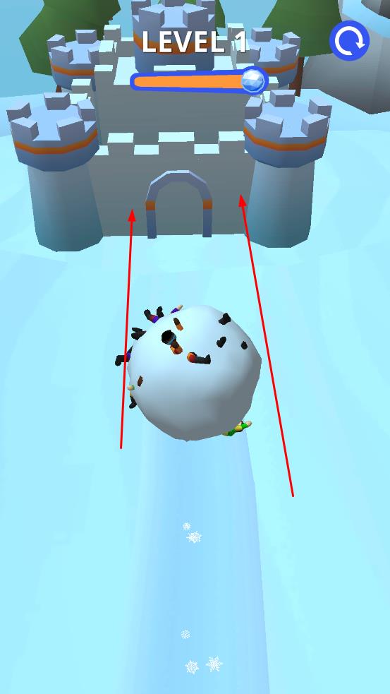 3、當(dāng)雪球增大到合適體積后,朝著城堡方向推進(jìn),最終讓雪球沖入城堡大門,完成關(guān)卡挑戰(zhàn)。