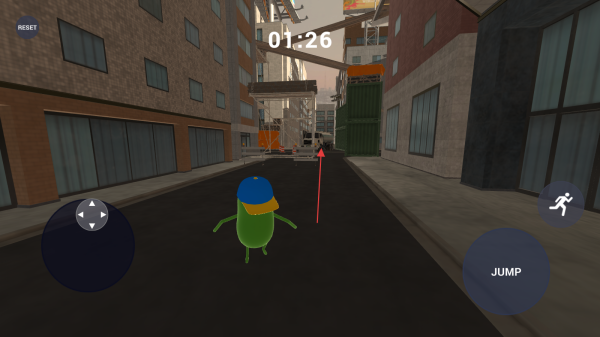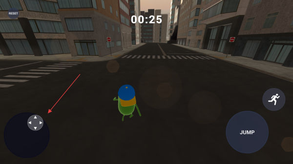 1、進(jìn)入游戲,用左側(cè)虛擬搖桿控制角色在城市道路移動,右側(cè)有JUMP跳躍和跑步按鈕可操作。