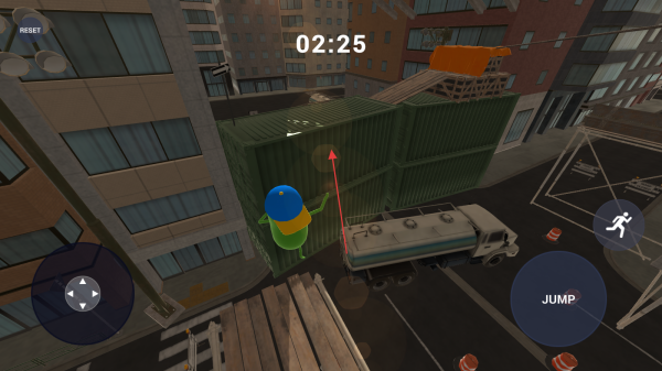 3、靠近集裝箱,點擊JUMP按鈕,讓角色跳躍并嘗試攀爬至集裝箱頂部,繼續(xù)探索城市場景。