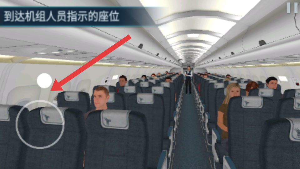 1、進(jìn)入模擬乘飛機(jī)流程的游戲后,跟隨屏幕指引向飛機(jī)客艙內(nèi)移動(dòng),通過(guò)觀察機(jī)組人員的手勢(shì)或座位旁的標(biāo)識(shí)。