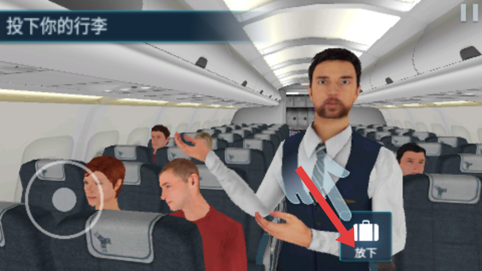 2、先點(diǎn)擊角色身旁的行李圖標(biāo),可將行李放置,在座位上方行李架或座位的下方,確保完成乘機(jī)的基礎(chǔ)的步驟。