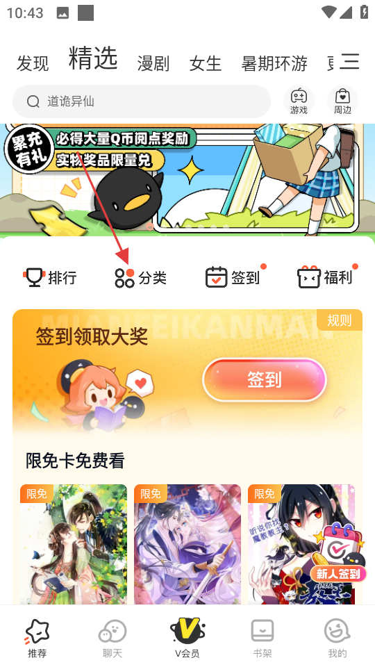 1、進入軟件后,在精選頁面,找到分類按鈕,點擊它可進入分類頁面。