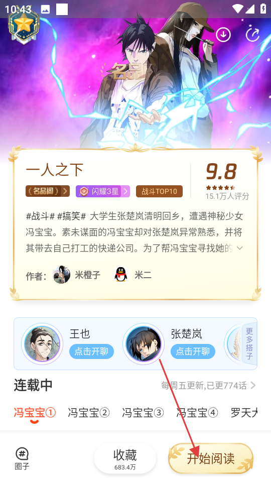 3、進入心儀作品詳情頁,比如一人之下,點擊開始閱讀按鈕,即可開啟閱讀。