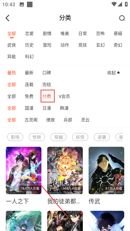 2、在分類頁面,找到付費選項,點擊后能篩選出付費類的作品。