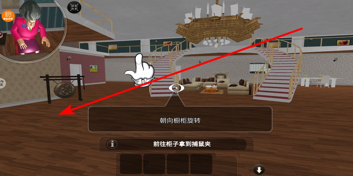2、在移動過程中,根據(jù)朝向櫥柜旋轉(zhuǎn)的提示,調(diào)整角色的方向,讓角色能準確朝向柜子,為后續(xù)打開柜子拿取物品做好準備。