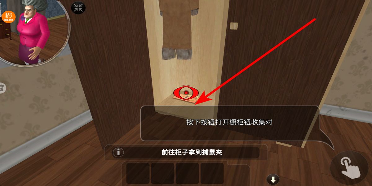 3、靠近柜子后,按照按下按鈕打開櫥柜鈕收集對的提示,與柜子進行互動操作,打開柜子,獲取里面的捕鼠夾等物品,完成任務。