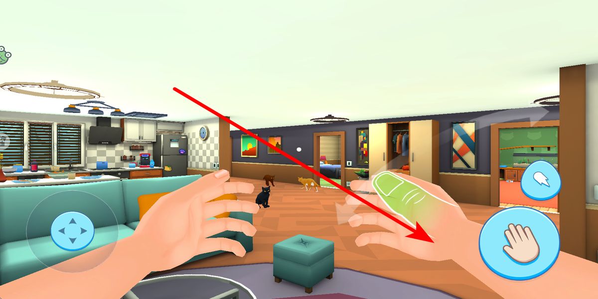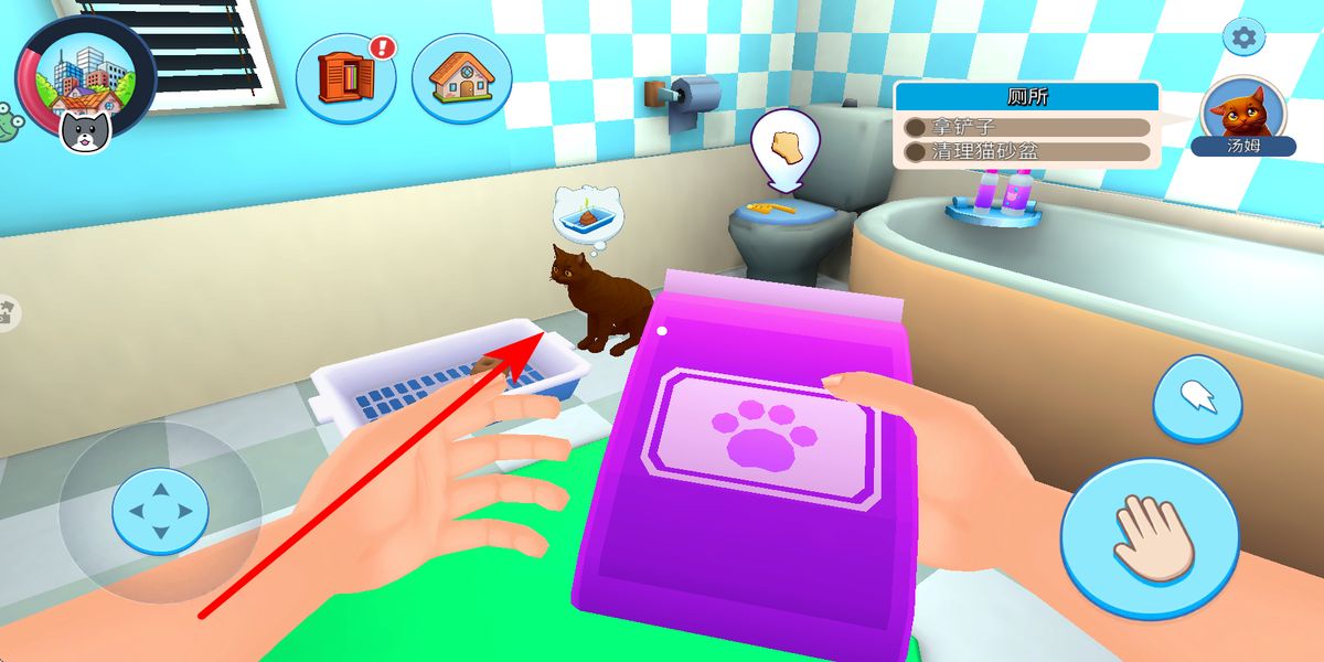 1、通過界面的方向按鍵操控角色在房間內(nèi)移動,探索客廳、廚房等不同區(qū)域,靠近貓咪,為后續(xù)與貓咪互動和照顧它們做準備。