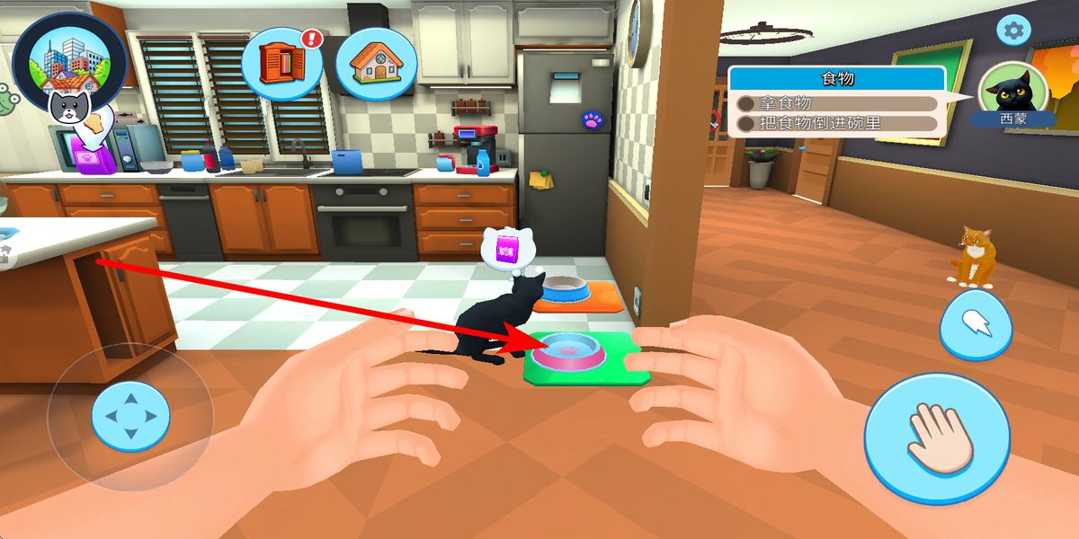 2、在廚房區(qū)域,看到貓咪的食碗,按照提示拿取食物,然后把食物倒進碗里,完成給貓咪喂食的操作,滿足貓咪的進食需求。