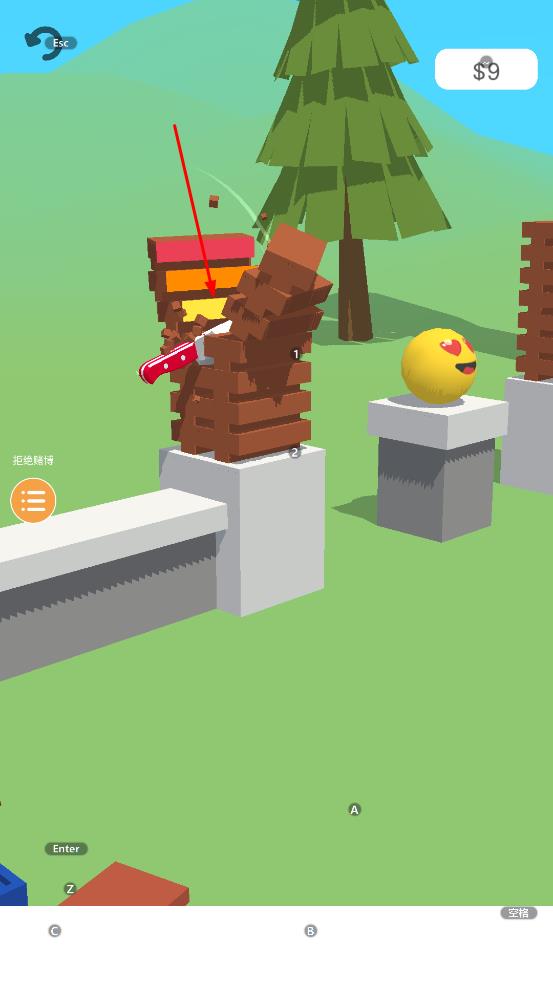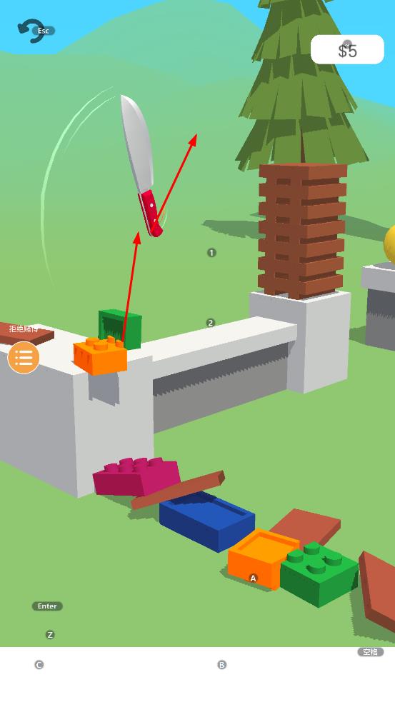 1、操控刀具向目標(biāo)投擲,擊中彩色積木等物體,破壞積木堆,開啟游戲內(nèi)的破壞挑戰(zhàn)。