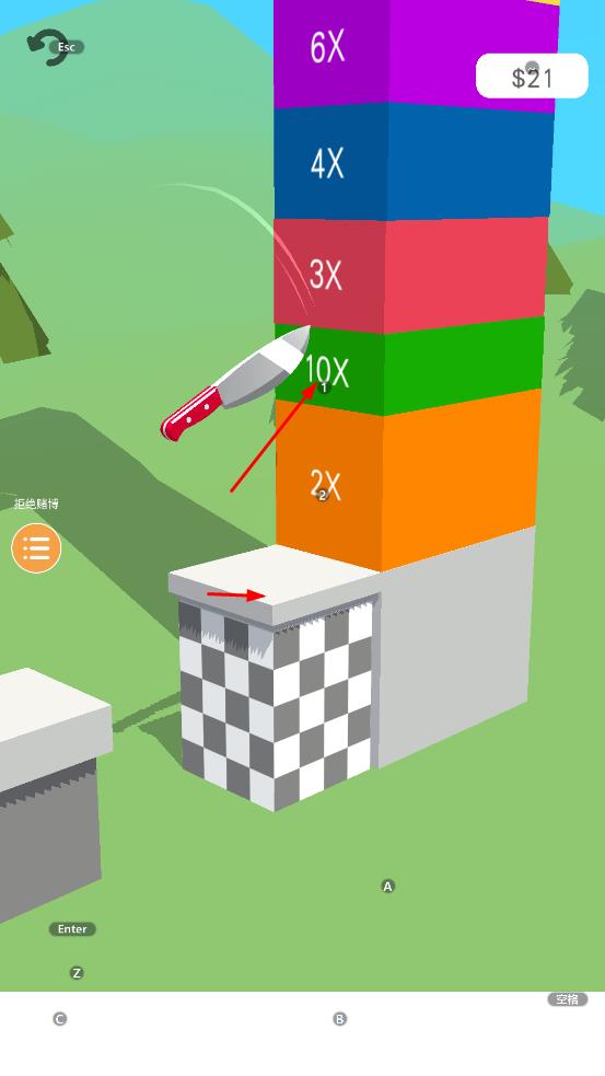 4、瞄準(zhǔn)彩色倍數(shù)柱,精準(zhǔn)投擲刀具,借助倍數(shù)效果獲取更多金幣,推進(jìn)游戲進(jìn)程。