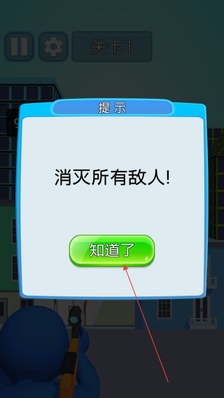 1、進(jìn)入游戲關(guān)卡1,看到提示消滅所有敵人,點(diǎn)擊知道了關(guān)閉提示框。