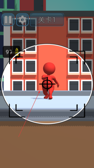 2、通過(guò)屏幕操作調(diào)整瞄準(zhǔn)鏡,對(duì)準(zhǔn)如紅色火柴人敵人后點(diǎn)擊射擊按鈕開(kāi)槍。