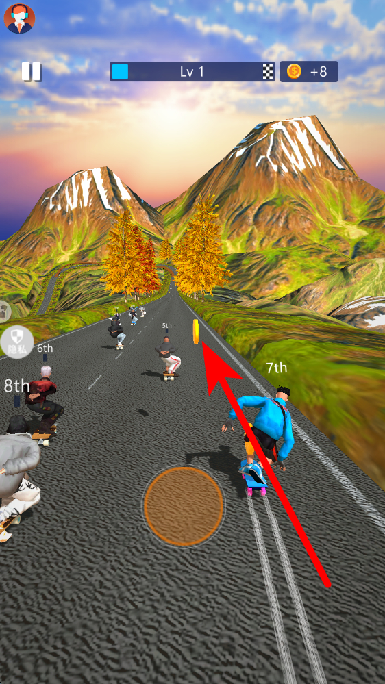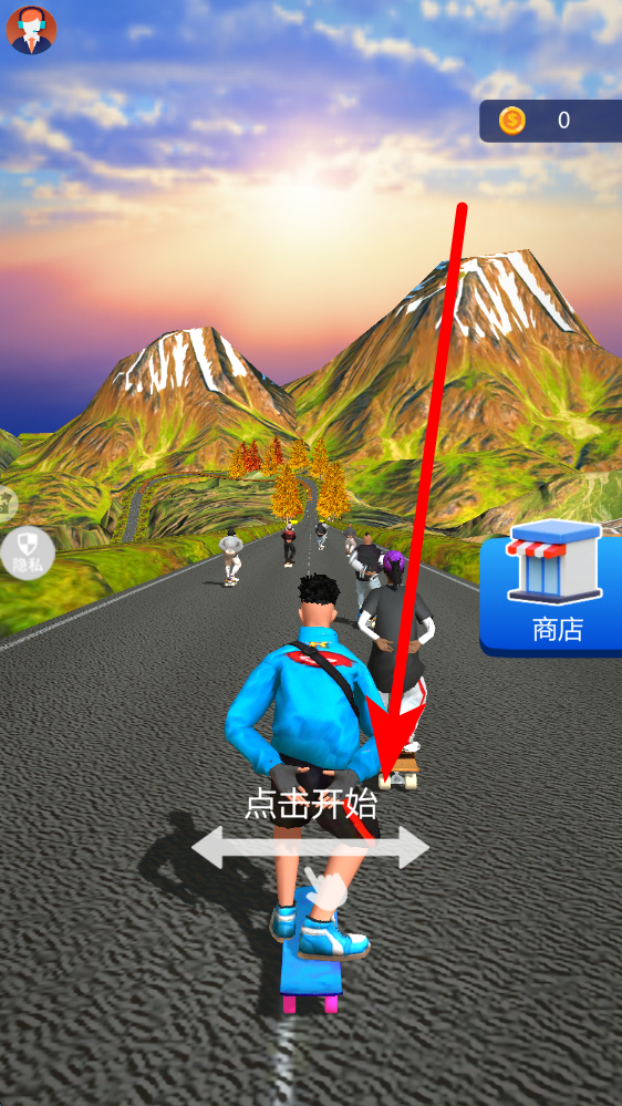 1、看到點(diǎn)擊開(kāi)始的提示,點(diǎn)擊該提示區(qū)域,即可開(kāi)啟滑板競(jìng)技比賽,操控角色在賽道上與其他選手一同出發(fā),展開(kāi)排名角逐。