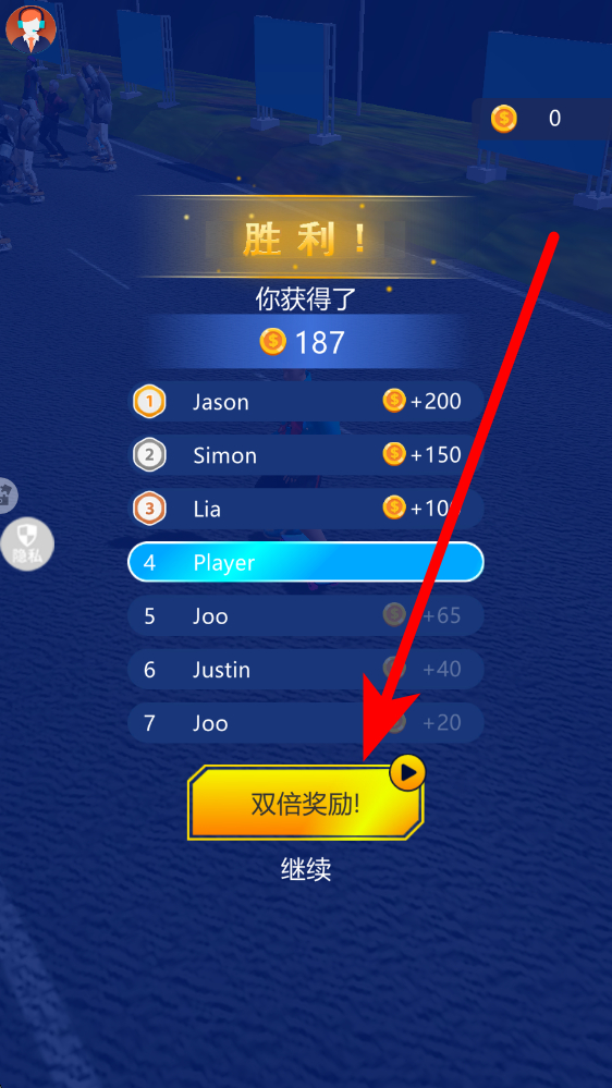 3、成功在比賽中獲得勝利后,會(huì)進(jìn)入獎(jiǎng)勵(lì)界面,此時(shí)可選擇領(lǐng)取雙倍金幣獎(jiǎng)勵(lì),這些獎(jiǎng)勵(lì)可用于后續(xù)提升角色或參與更多賽事。