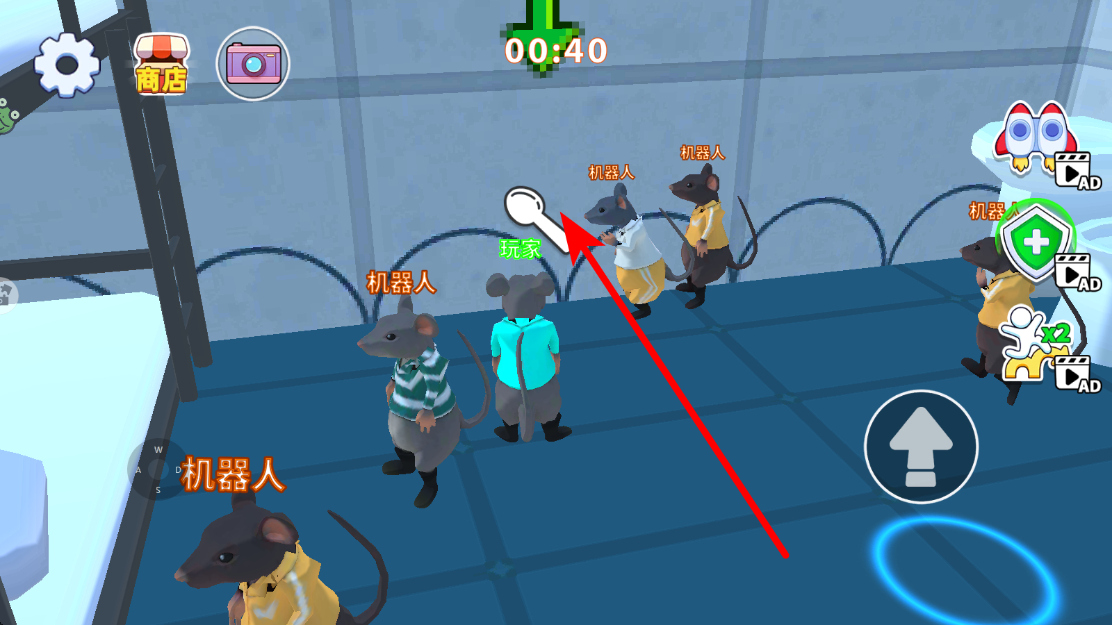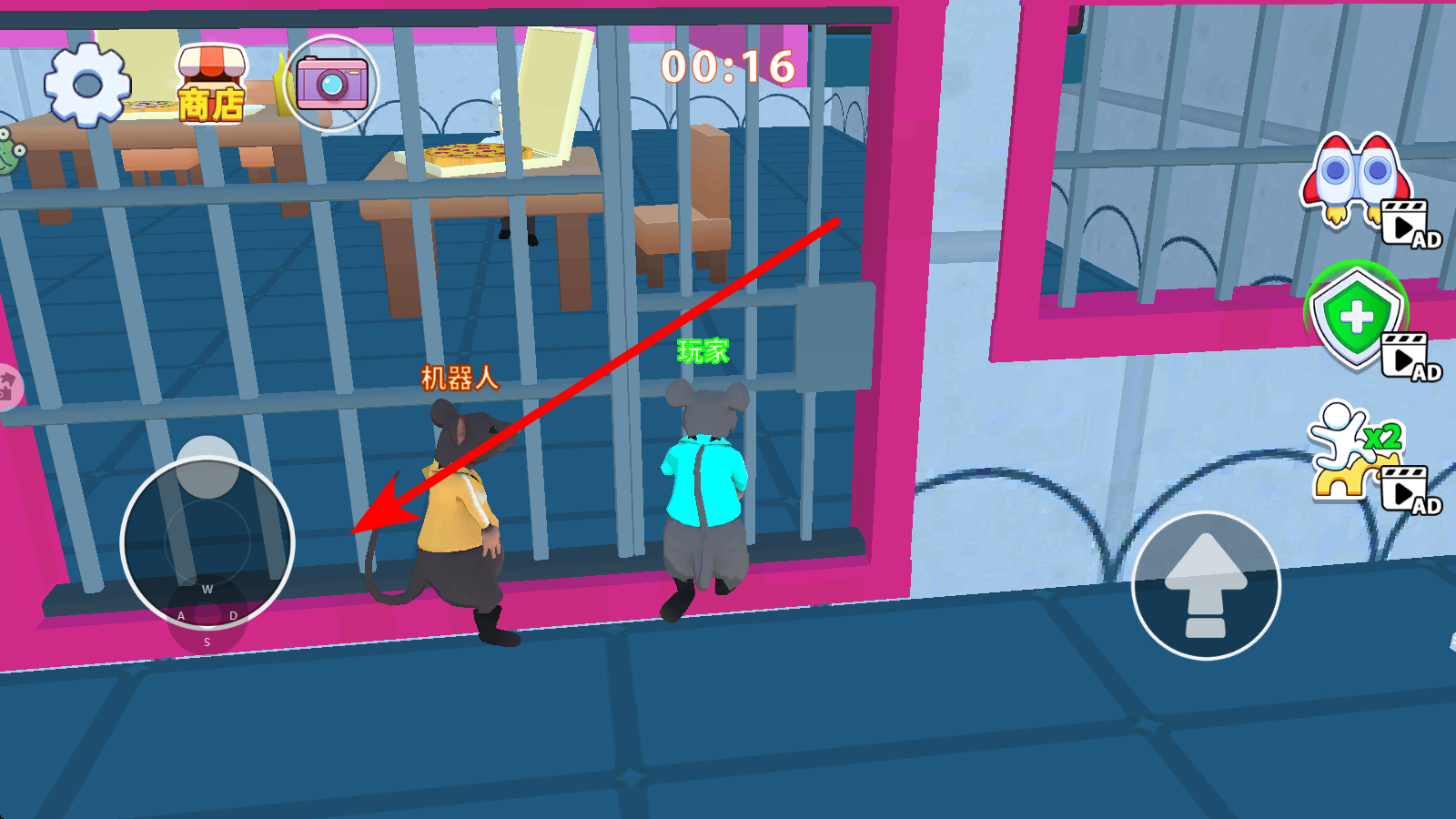 1、開始后通過左側操作按鈕,操控鼠鼠在場景中移動,靠近有機器人的區(qū)域,觀察周圍環(huán)境,為后續(xù)行動做準備,開啟逃亡之旅。