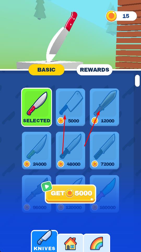 4、進(jìn)入武器選擇界面,可使用積累的金幣購(gòu)買不同類型的飛刀,更換武器來提升投擲體驗(yàn)與游戲樂趣。
