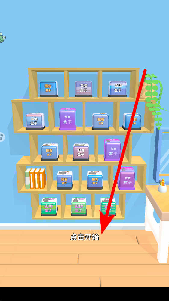 1、點(diǎn)擊開始,進(jìn)入游戲界面,此時(shí)會(huì)看到擺滿各類盒子的架子,根據(jù)喜好或需求,挑選想要開啟的盒子,為后續(xù)撕紙做準(zhǔn)備。