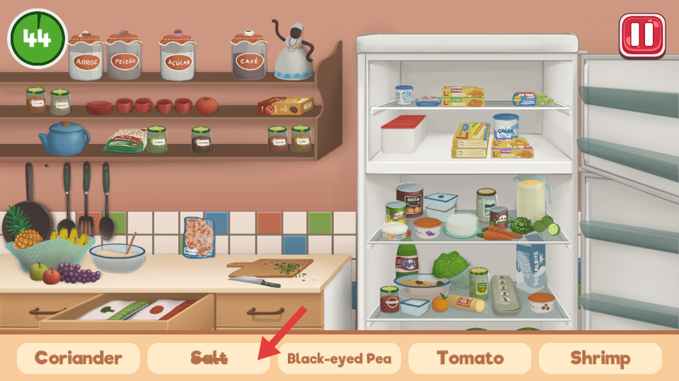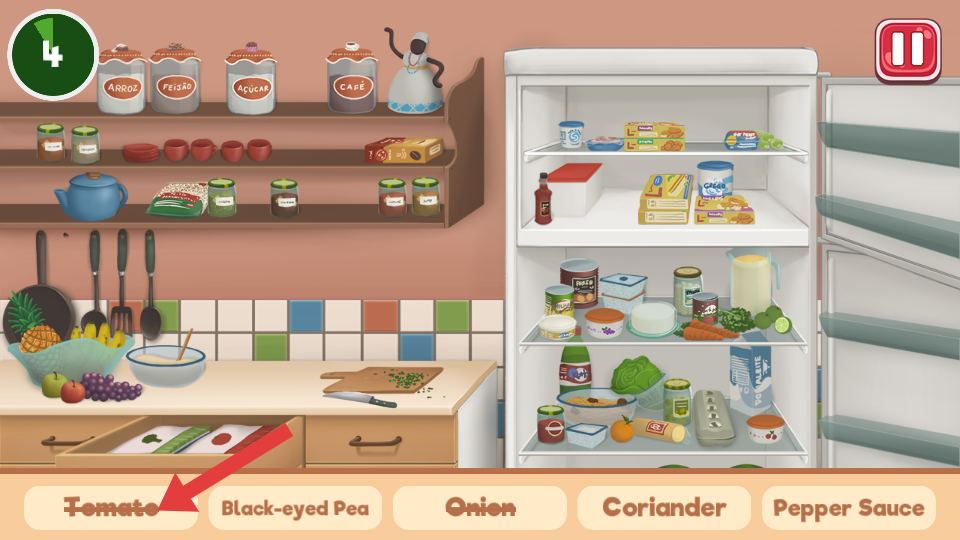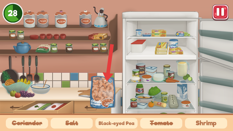 1、進(jìn)入廚房場景后先查看冰箱和櫥柜,冰箱里能找到蝦部分醬料等冷藏食材,櫥柜上有番茄、黑眼豆。