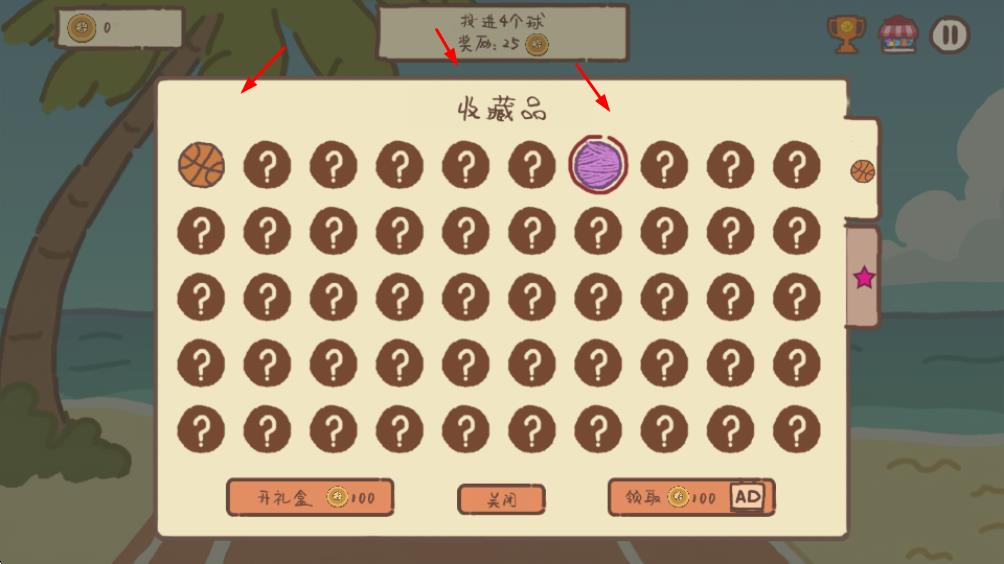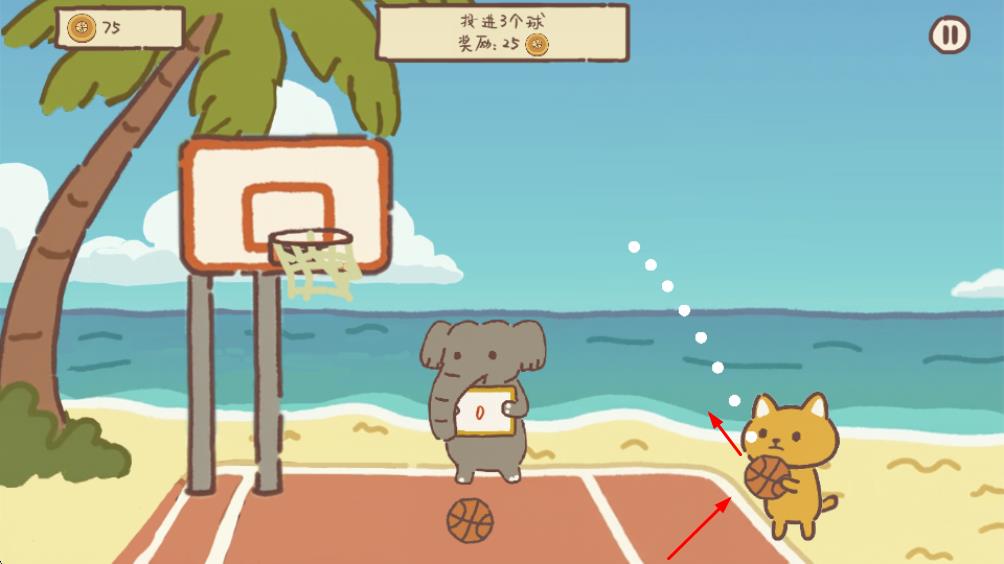 1、在海灘籃球場場景中,操控小動物投籃,瞄準(zhǔn)籃筐投擲籃球,嘗試達(dá)成投進(jìn)3個球等目標(biāo),獲取25金幣等獎勵。