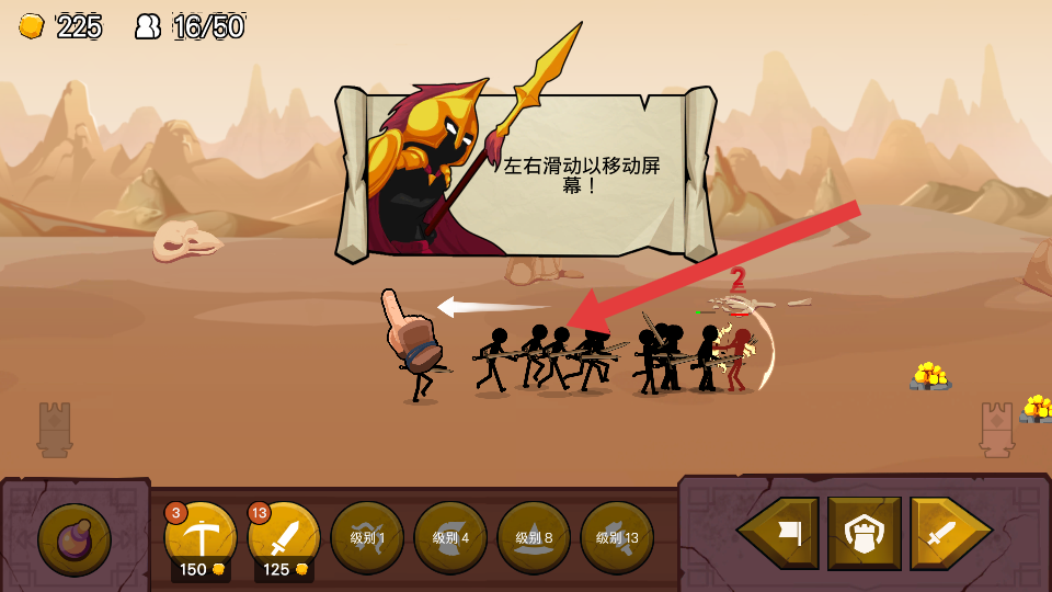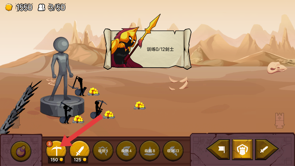1、游戲開(kāi)局,可花費(fèi)125金幣訓(xùn)練劍士,按提示逐步完成訓(xùn)練0/12劍士的招募任務(wù),組建基礎(chǔ)戰(zhàn)斗部隊(duì)。
