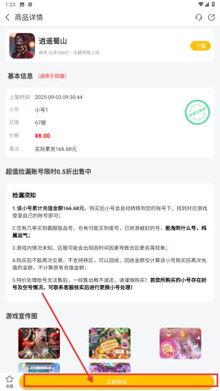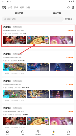 2、在交易頁面,找到逍遙蜀山售價(jià)為0元的商品,點(diǎn)擊該商品,進(jìn)入商品詳情頁面。