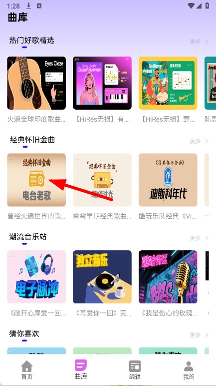 2、在曲庫頁面的經(jīng)典懷舊金曲板塊中,點擊電臺老歌。