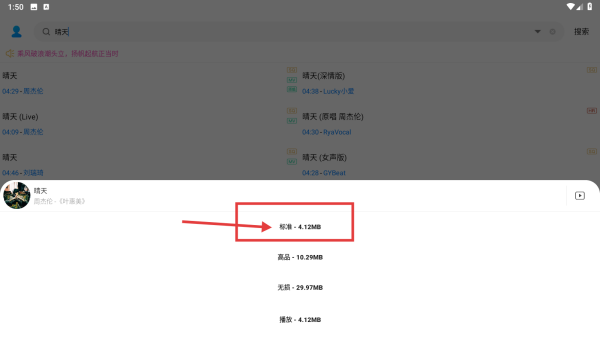 2、在搜索結(jié)果中,找到并點擊晴天-周杰倫伴奏版,進(jìn)入該音樂的版本選擇頁面。