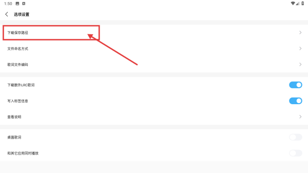 3、在選項設(shè)置頁面,點擊下載保存路徑選項,可設(shè)置音樂等文件的下載保存位置。