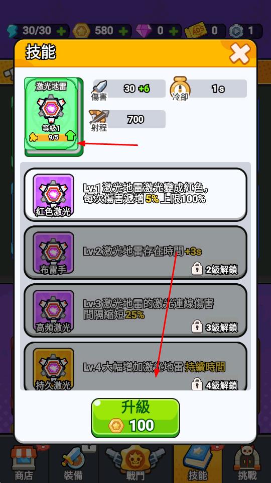 1、進入技能界面,消耗金幣可升級激光地雷技能,提升傷害、射程等屬性,還能解鎖紅色激光,布雷手等更高級效果,增強戰(zhàn)斗能力。