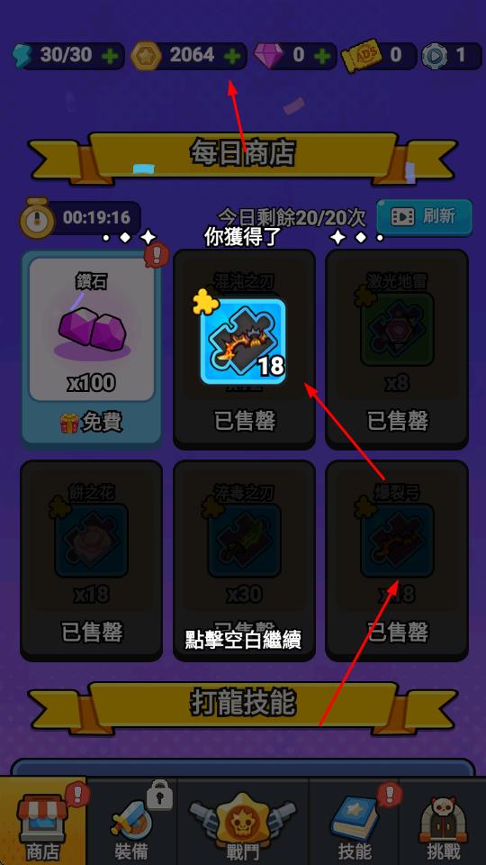 2、在每日商店中,可獲取鑽石,混沌之刃,激光地雷等道具,助力游戲進程,注意每日剩余次數,合理兌換資源。