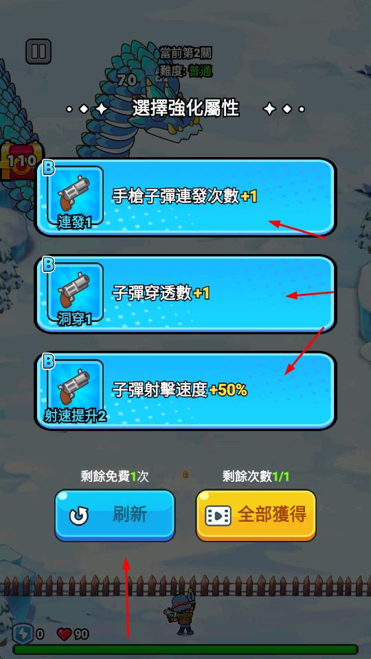 3、在第2關的強化屬性選擇界面,也能刷新或通過觀看視頻全部獲得,優(yōu)化射擊戰(zhàn)力攻克關卡。