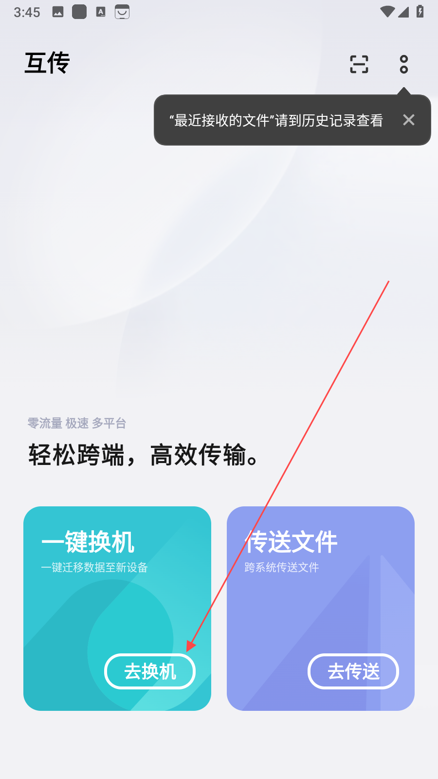 1、在新舊設(shè)備上都打開互傳應(yīng)用,在互傳主界面點擊一鍵換機板塊中的去換機按鈕。