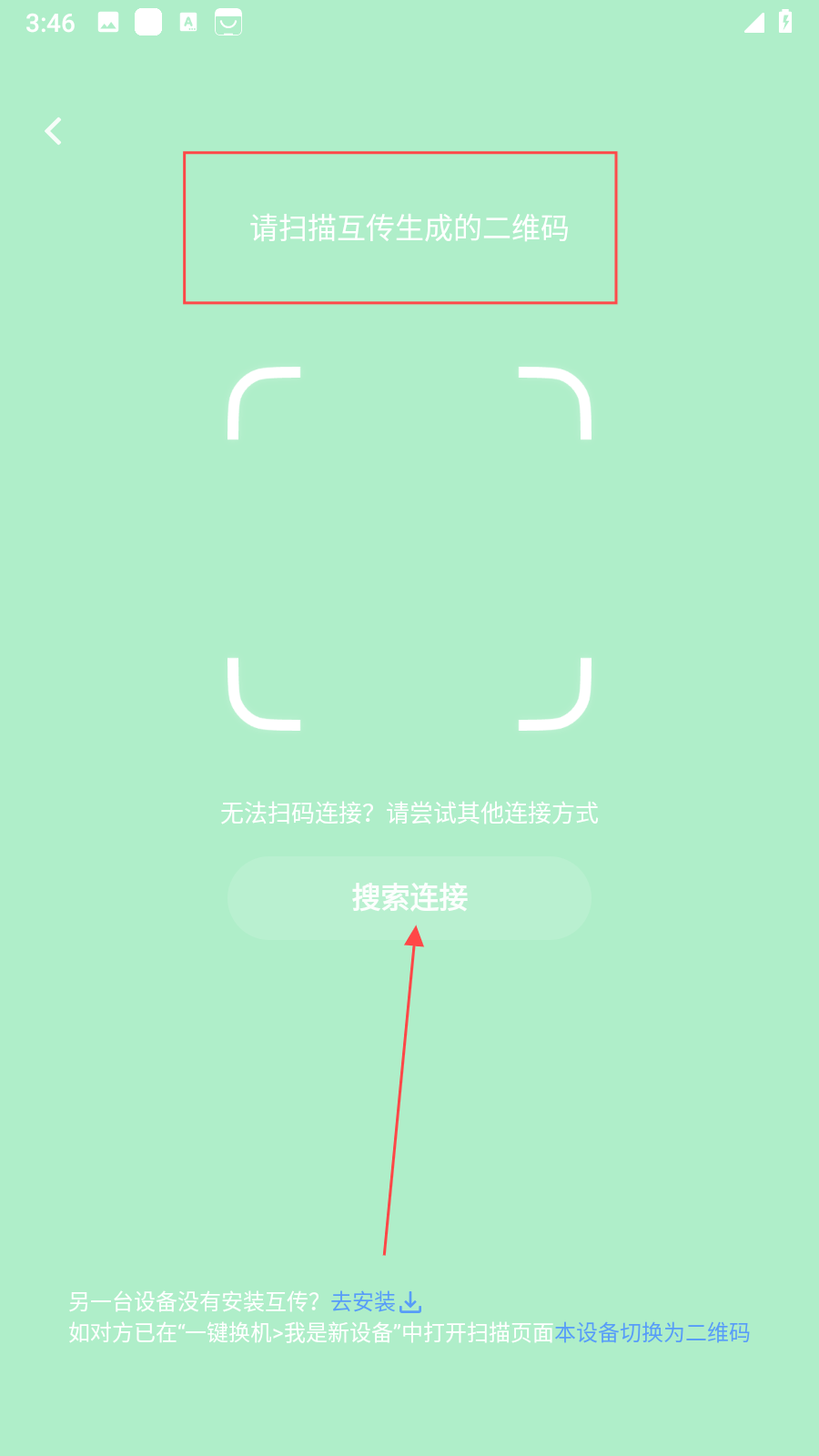 3、用新設(shè)備掃描舊設(shè)備上互傳生成的二維碼進行連接,如果無法掃碼,點擊新設(shè)備頁面的搜索連接來查找舊設(shè)備,成功后選擇要遷移的數(shù)據(jù),等待數(shù)據(jù)從舊設(shè)備導出并傳輸?shù)叫略O(shè)備。