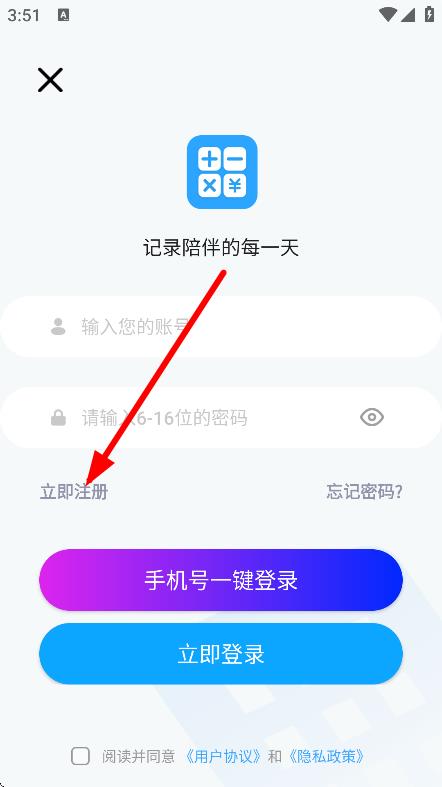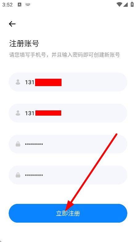 3、在注冊賬號頁面,填寫手機(jī)號和密碼后,點擊立即注冊,完成賬號注冊。