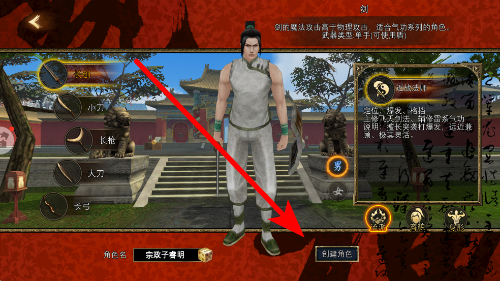 1、新手開始游戲,可選擇武器,如長劍等,還能設(shè)置角色名,之后點擊創(chuàng)建角色,打造屬于自己的古風(fēng)角色,開啟在尋夢絲路的冒險之旅。