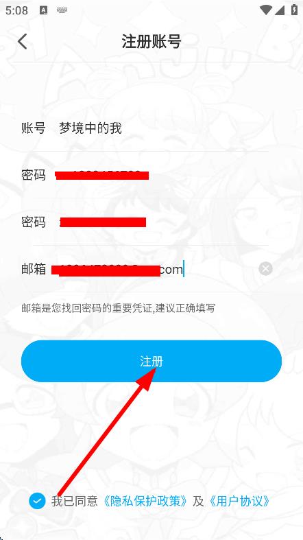 3、在注冊(cè)賬號(hào)頁(yè)面,填寫(xiě)賬號(hào)、密碼、郵箱等信息后,點(diǎn)擊注冊(cè),完成賬號(hào)注冊(cè)。