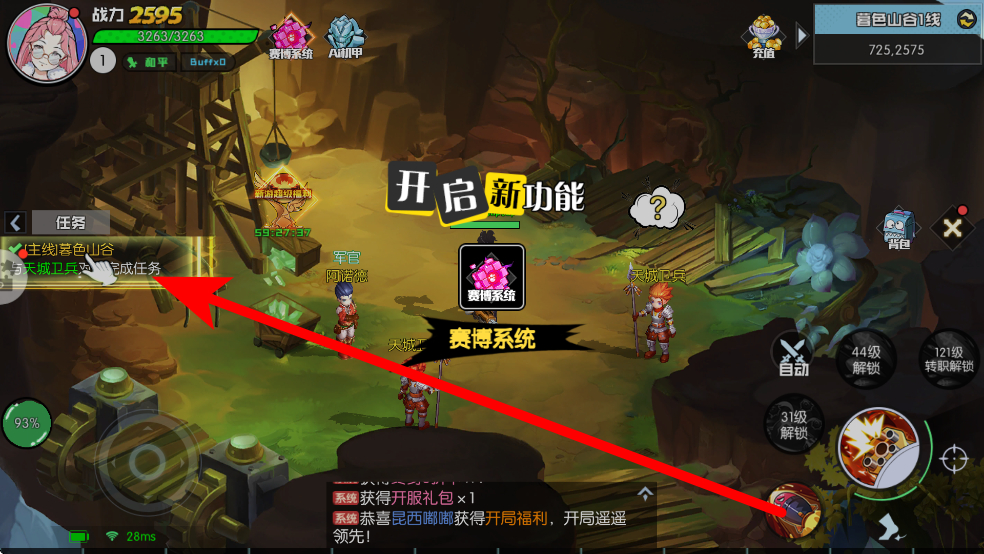 2、進(jìn)入游戲主場景后,左側(cè)會有主線任務(wù)提示,如主線暮色山谷,跟隨主線任務(wù)指引,與相關(guān)NPC交互,完成任務(wù)不僅能推進(jìn)游戲進(jìn)程,還能解鎖新功能。